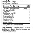Hlavné zložky: esenciálne oleje z kôry divokého pomaranča, klinčeka, kôry škoricovníka, listu eukalyptu a listu/kvetu rozmarínu + čierne korenie, oregano, medovka. Extra panenský olivový olej, kukuričný škrob modifikovaný bez GMO, glycerín, karagén, destilovaná voda, maltitol.